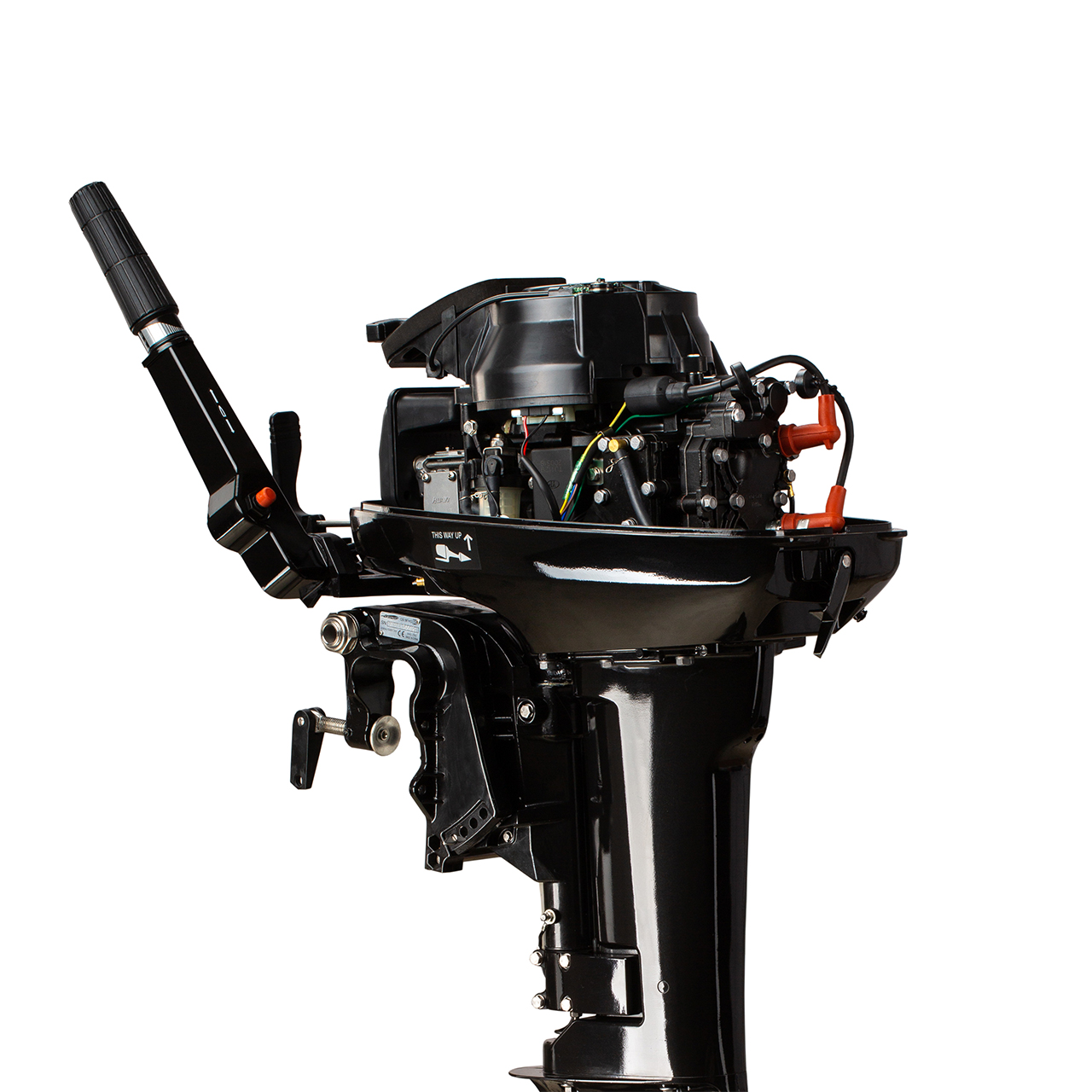 Мотор запускается ручным стартером и управляется стандартным румпелем с поворотной ручкой газа (гашеткой мотоциклетного типа) с антипроскальзывающими насечками.